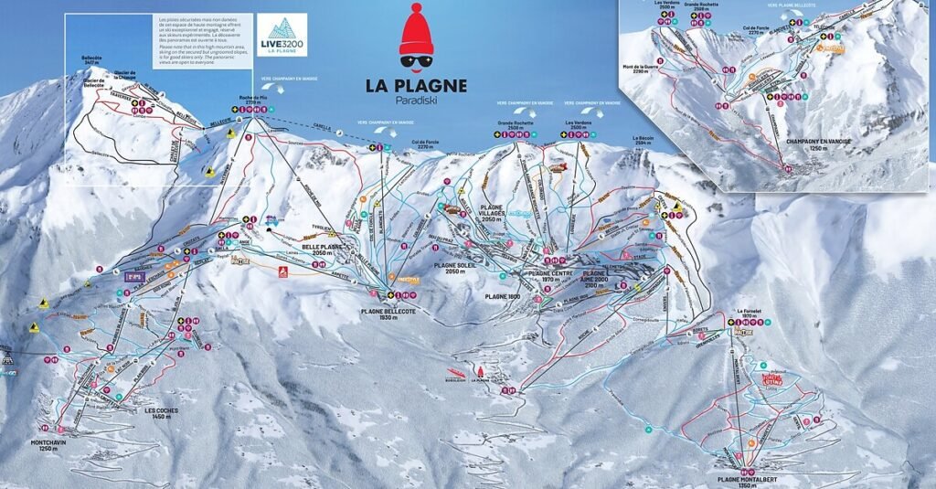 Accès en transport : gare SNCF d’Aime-La Plagne en vallée, puis liaisons par bus/navettes vers les stations (services renforcés en saison). Aéroports à proximité avec transferts dédiés en hiver : Chambéry, Genève, Lyon, Grenoble. Renseignez-vous sur les navettes saisonnières et les horaires pour optimiser votre arrivée.